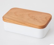 白いホウロウに天然木蓋の組み合わせが魅力のバターケース。においうつりがなく、冷却性の高いホウロウはお手入れもしやすく、バターの保存にも適している材質です。温かみのある自然な風合いの天然木(桜)蓋の組み合わせがつかうたびに嬉しくなります。本体ごとひっくり返し木蓋をバターのカッティングボードにする事もできます。