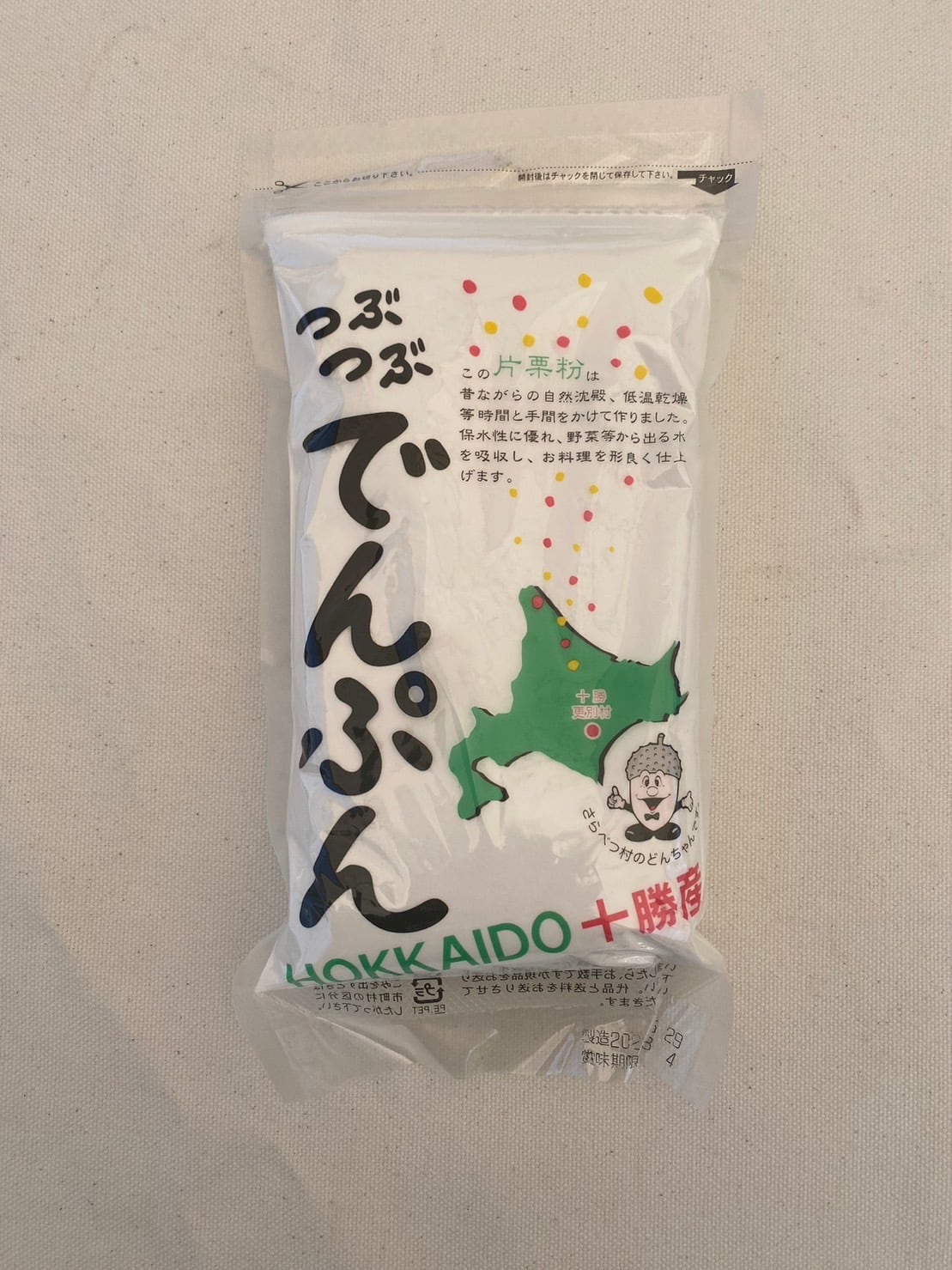 十勝の馬鈴薯を原料に日高山脈の伏流水で、昔ながらの自然沈殿法に手を加えて、低温長時間乾燥して作られました。保水能力抜群で腰のある粘りが特徴です。油料理では油切れがよくカラッと揚がります。一般の片栗粉よりも量を少な目にして色々な料理にお試し下さい。