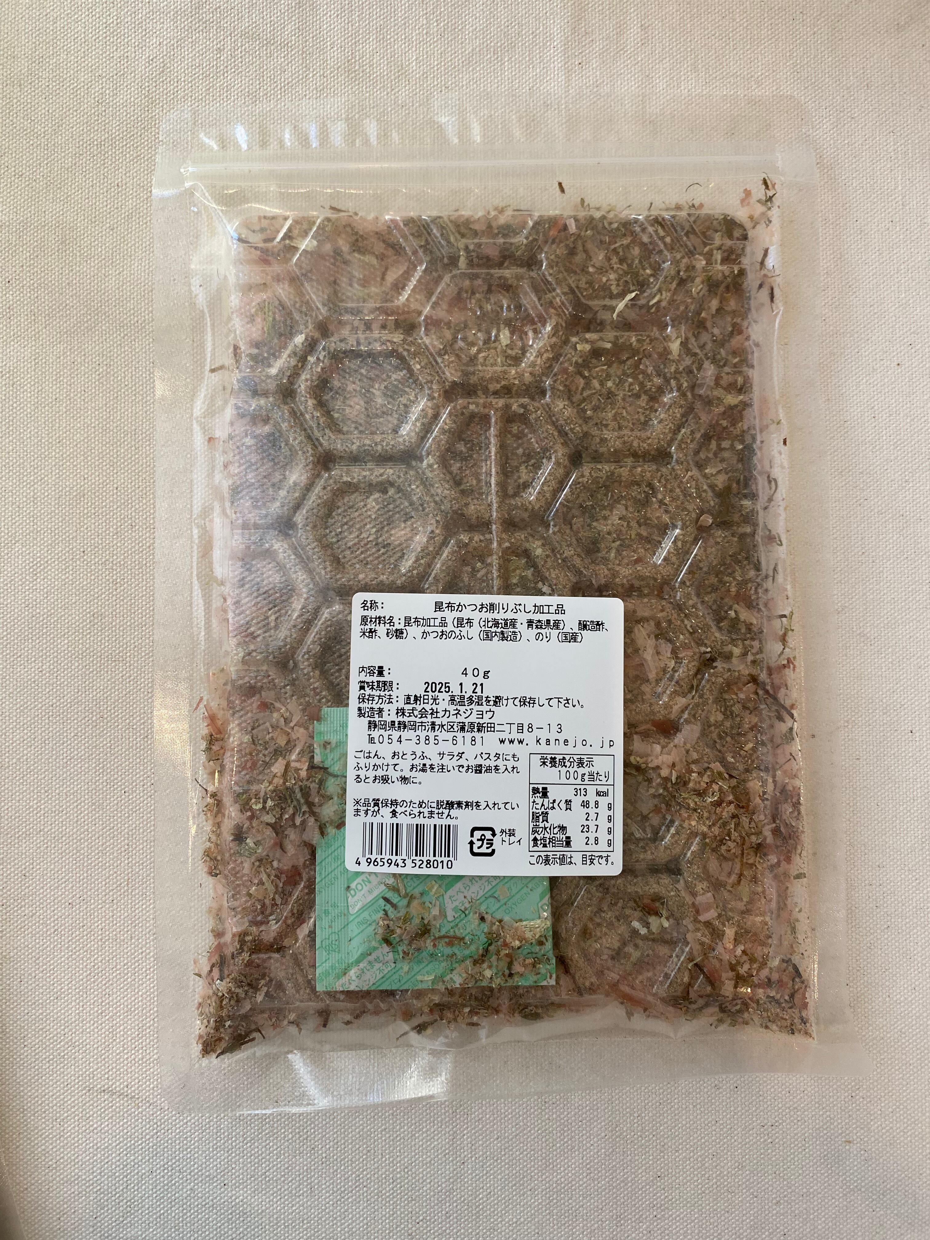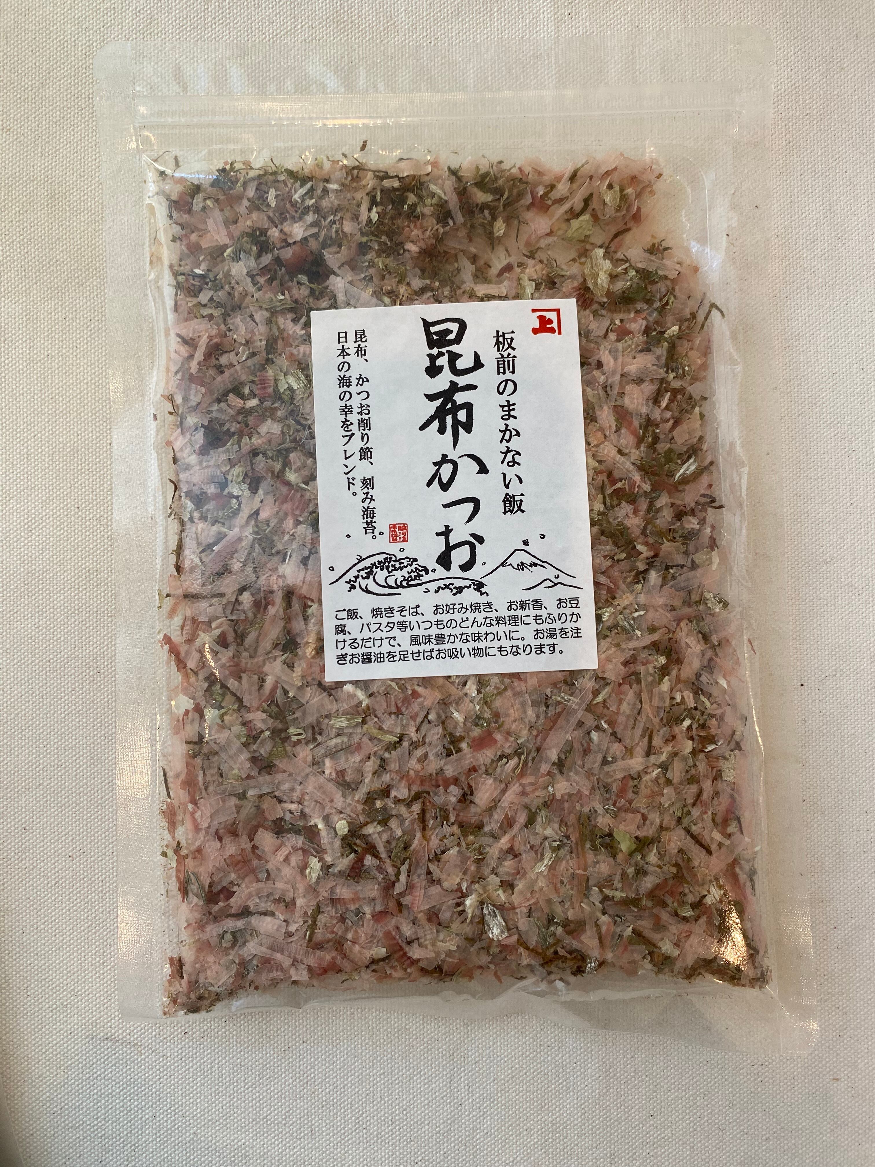 昆布、かつお削り節、焼き海苔を使った食塩無添加のふりかけ。素材本来の旨味がきいており、味付けしたお料理にもふりかけて使えます。ご飯、焼きそば、お好み焼き、お新香、お豆腐などに。お湯を注ぎ醤油を足せばお吸い物にもなります。
