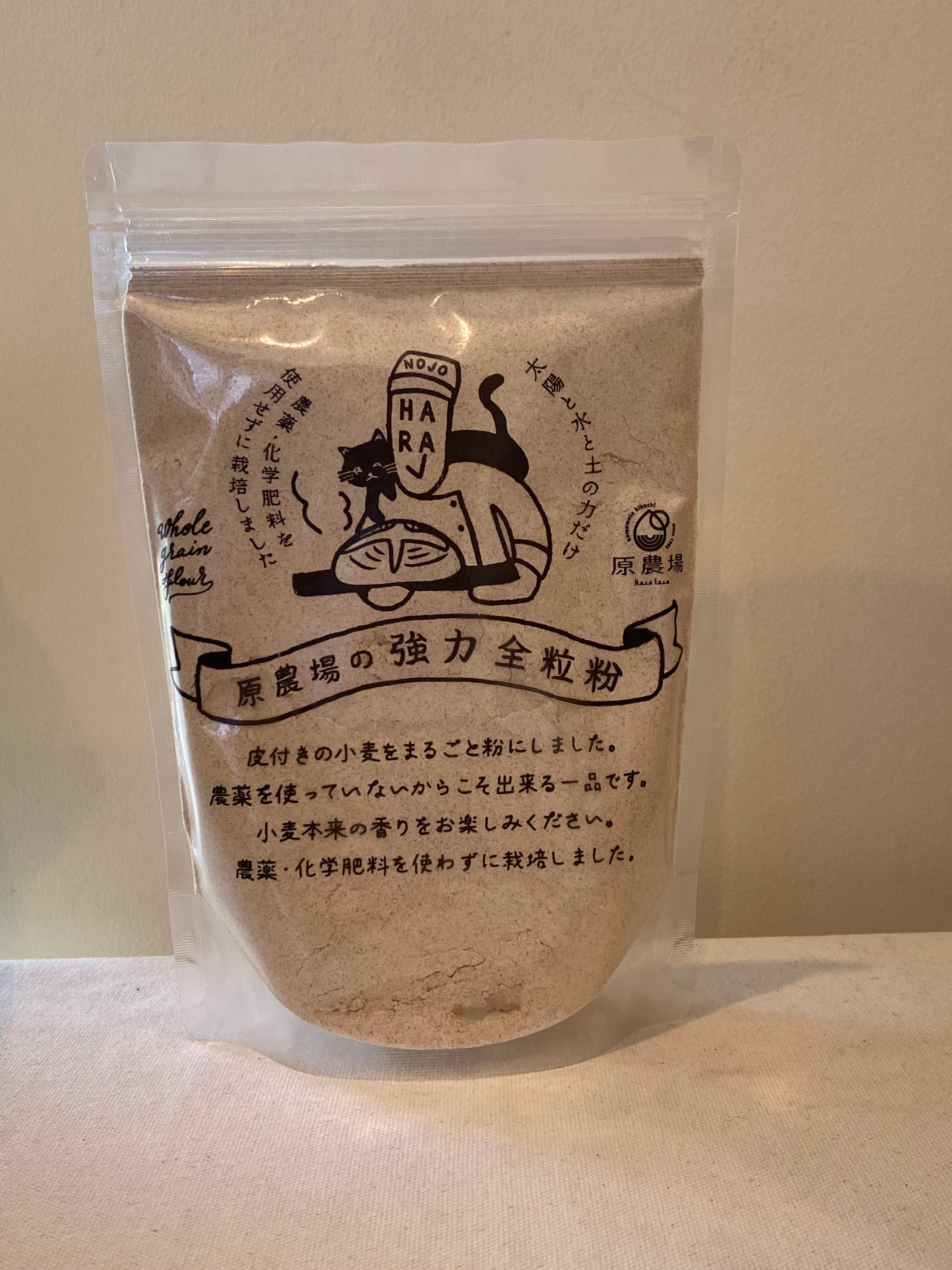 原農場で農薬、化学肥料を使用しないで栽培した「ミナミノカオリ」という品種の小麦を、皮まで丸ごと製粉しました。