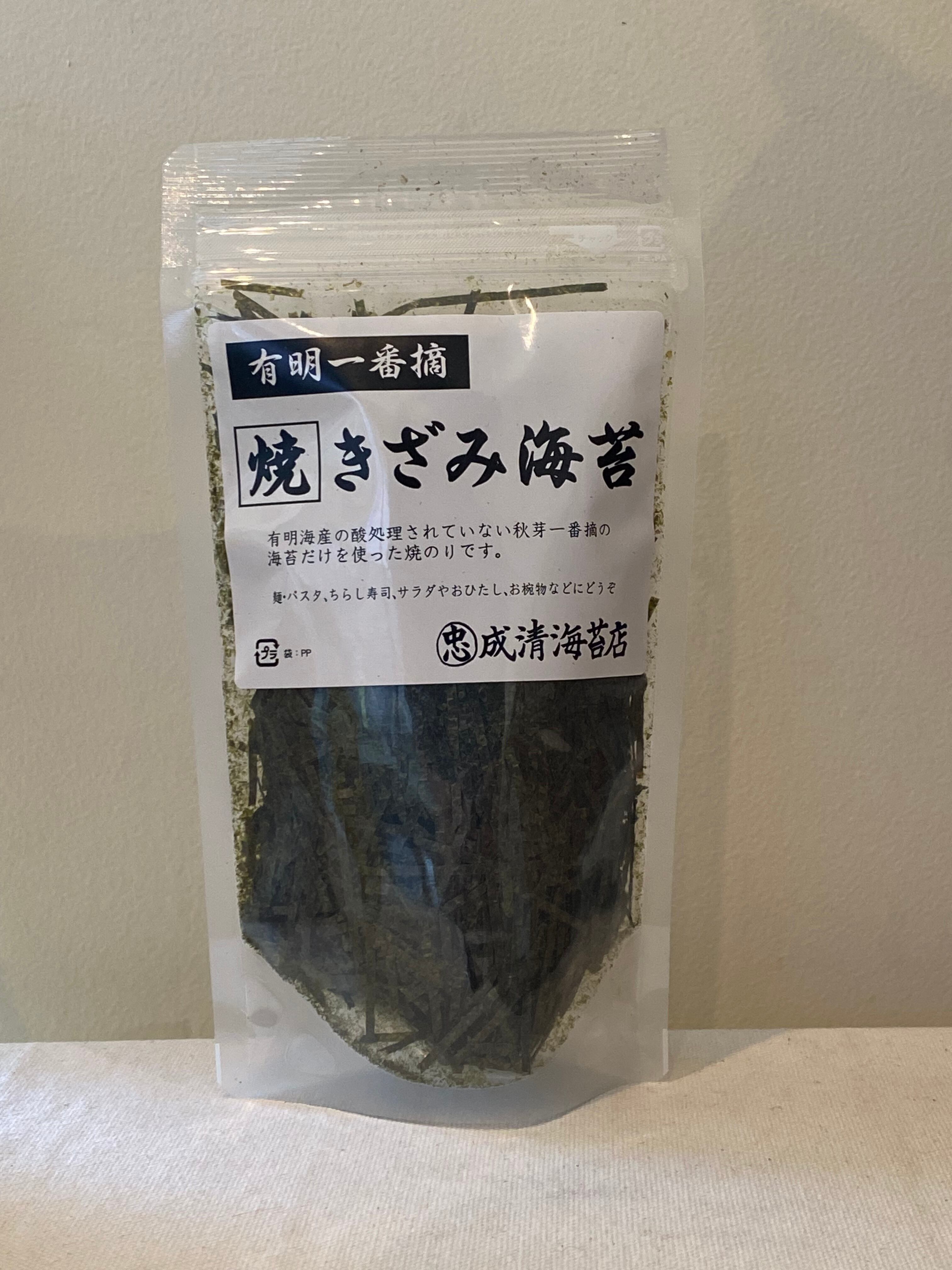 成清海苔店 焼きざみ海苔 20g 有明海産の活性処理(酸処理)をしていない秋芽一番摘の海苔だけを使った焼き海苔です。 麺、パスタ、ちらし寿司、サラダやおひたし、お椀物などにどうぞ。
