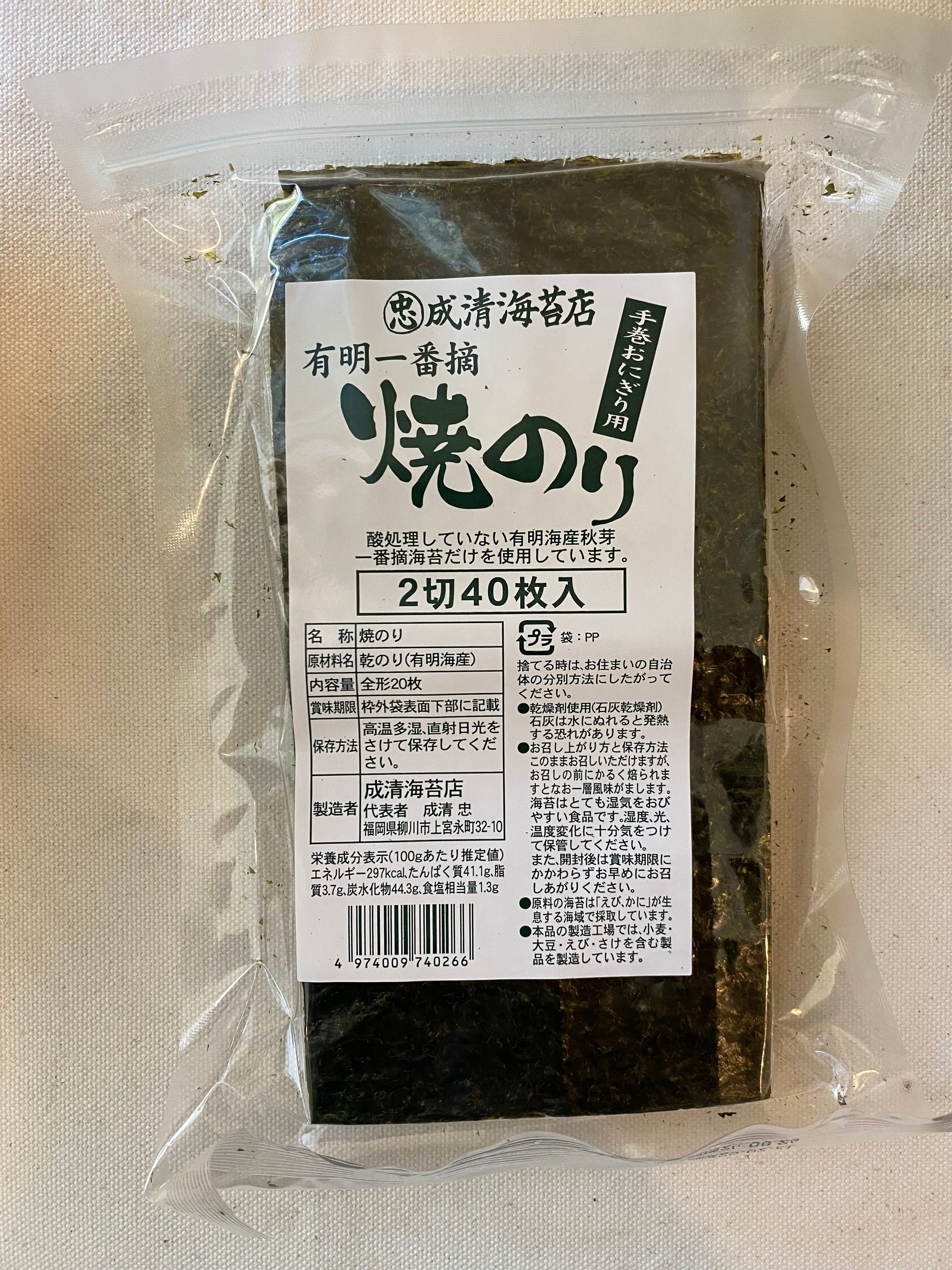 成清海苔店 焼海苔 全形20枚 2切40枚入 手巻おにぎり用 増量タイプのお徳用の焼海苔です。 有明海産の活性処理(酸処理)をしていない秋芽一番摘の海苔だけを使った焼き海苔です。